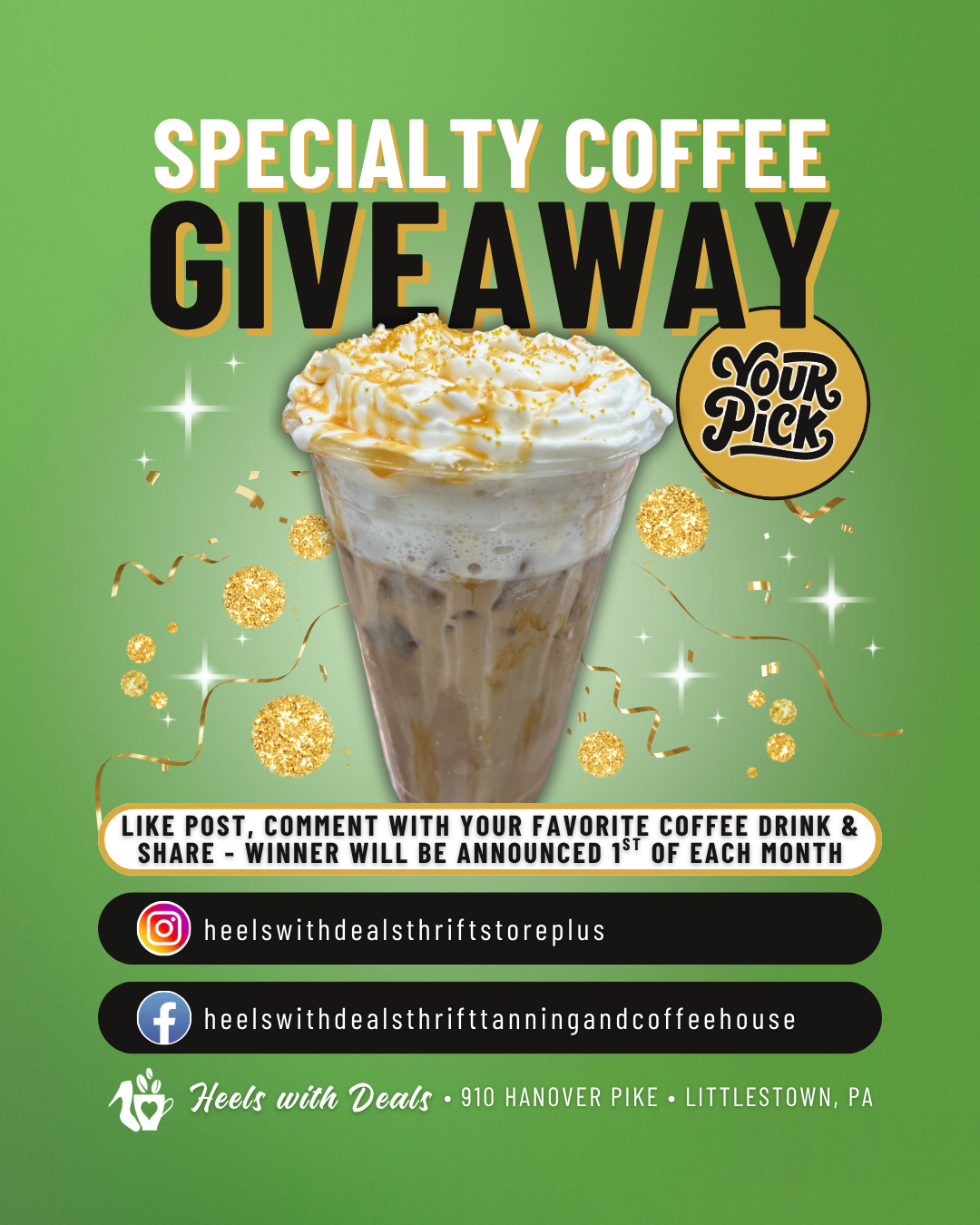 Heels with Deals is a female, mom owned, small, local business in Littlestown, PA. It is a one-stop convenience and thrift store with a full service coffeehouse inside along with a tanning parlor.
