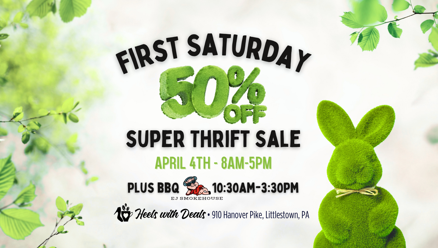 SIP, SHOP, SAVOR & SAVE with secondhand finds during our one day a month Mega Thrift Sale! Every first Saturday of the month - ALL THRIFT is 50% off storewide! No tag colors - just EVERYTHING! Plus EJ Smokehouse BBQ Food Truck will be onsite!